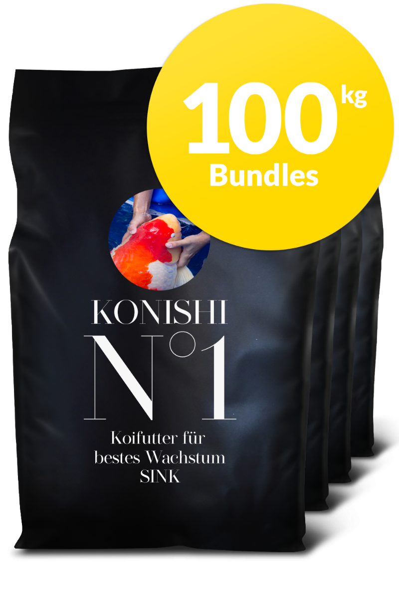 In unserer neuen ausgewogenen Rezeptur reduzieren wir den Proteingehalt von seither 40% auf nunmehr nur noch 30%. Verschiedene Versuche haben gezeigt, dass dies den Stoffwechsel der Koi entlastet, den Appetit stimuliert, die Konzentrationen an Ammonium, Nitrit, Nitrat und Phosphat bedeutend senkt, die Kotausscheidung sichtbar reduziert und das Wachstum und den Volumenaufbau von Koi fördert. Konishi No. 1 richtet sich insbesondere an Koihalter, deren Focus auf maximaler Wachstumsgeschwindigkeit und Volumenaufbau gerichtet ist. Dies betrifft insbesondere Koibestände, deren überwiegender Bestand aus Koi zwischen 20-70 cm aufgebaut ist. Es ist ein Alleinfuttermittel und kann ganzjährig über alle Temperaturbereiche gefüttert werden. Jedoch sollte die Futtermenge der Wassertemperatur und der Aktivität der Koi stets angepasst werden.
